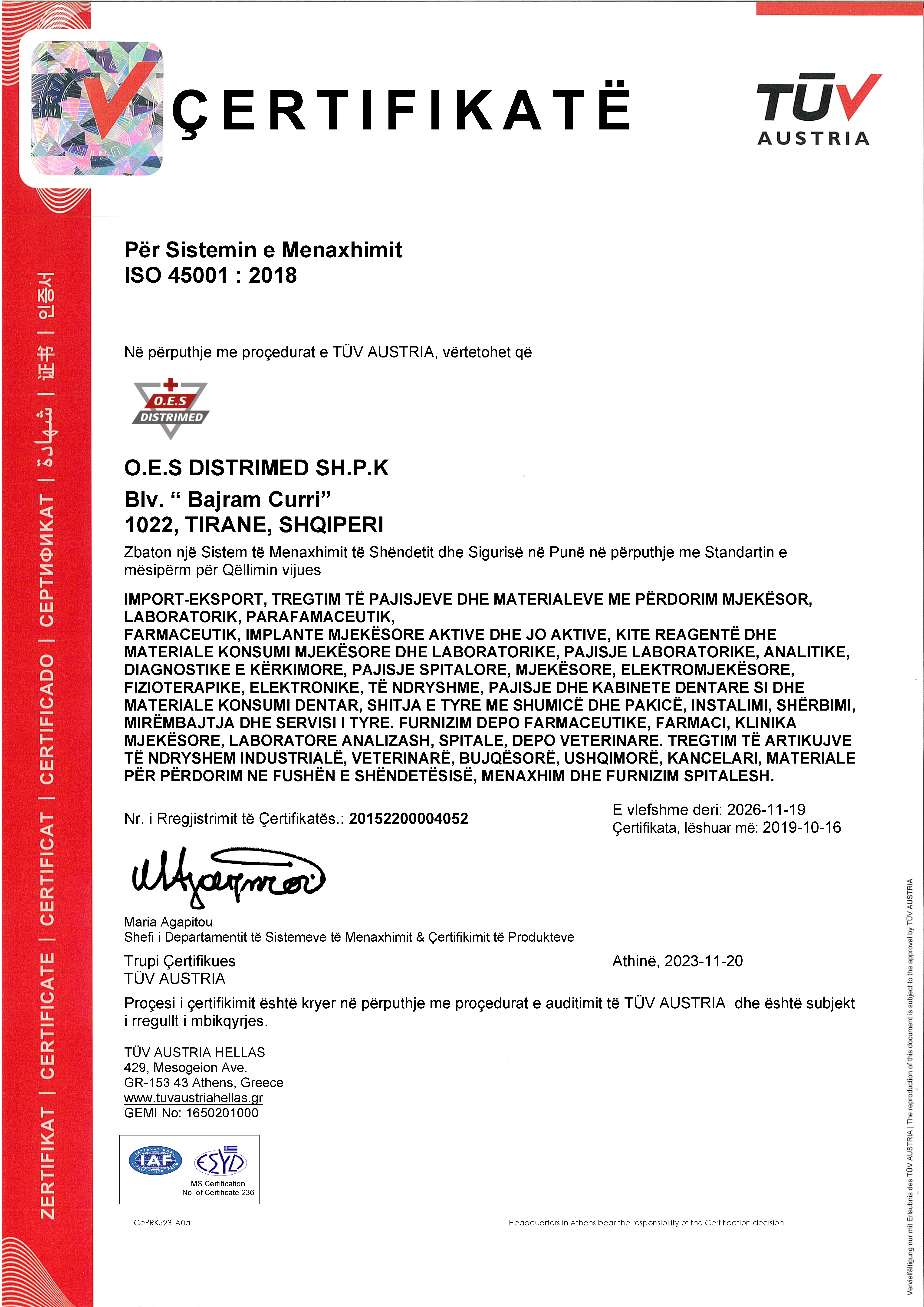 ÇERTIFIKATË Për Sistemin e Menaxhimit ISO 45001 : 2018