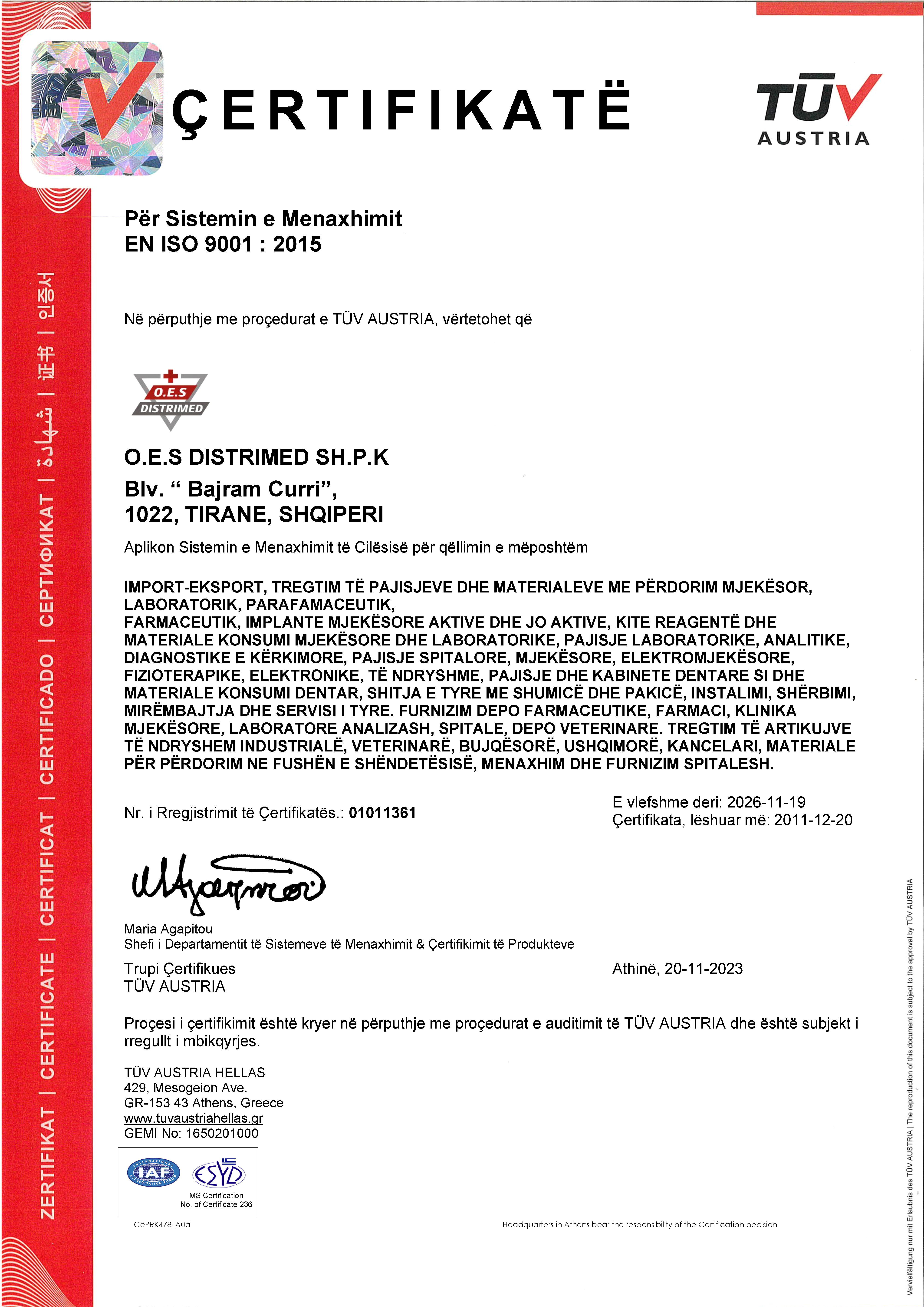 ÇERTIFIKATË Për Sistemin e Menaxhimit EN ISO 9001 : 2015