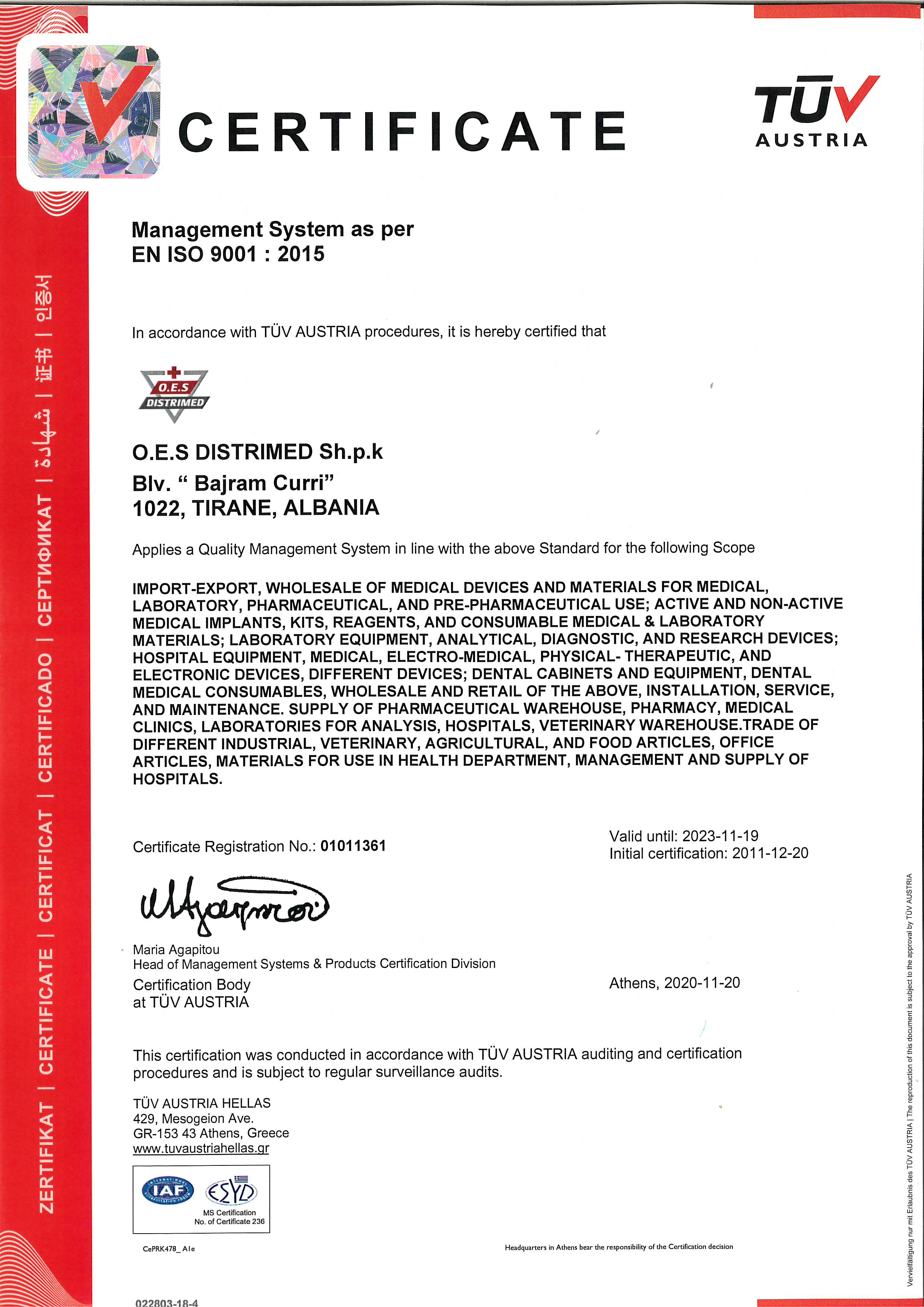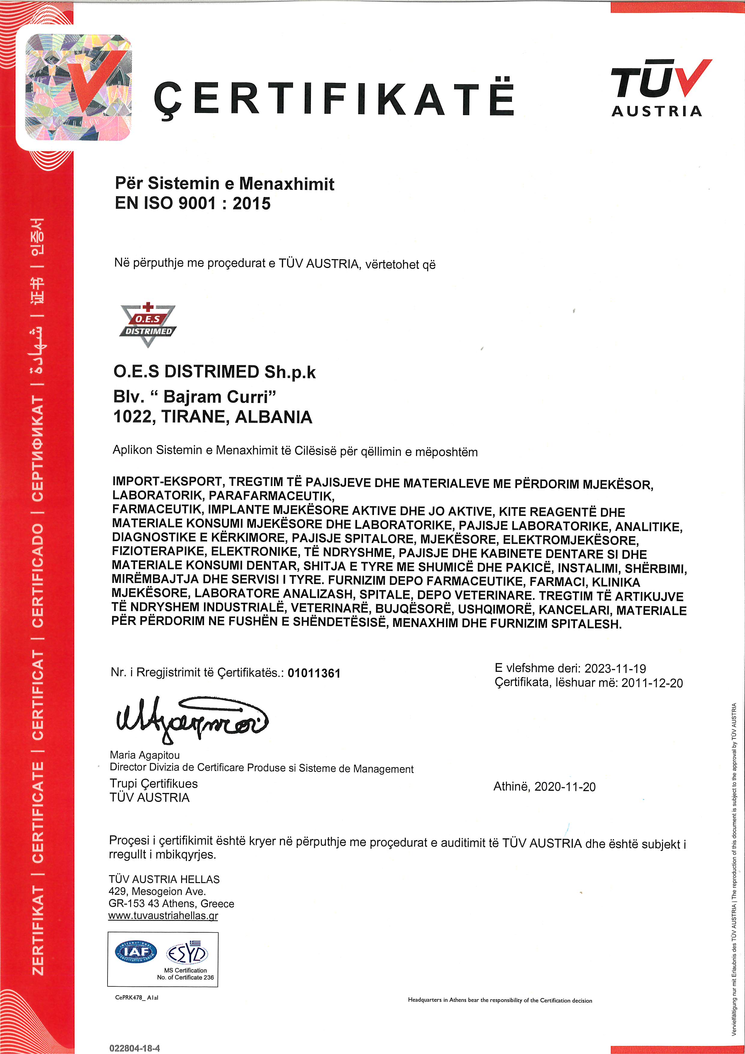 Certifikate Sistem Menaxhimi ISO 9001 : 2015.